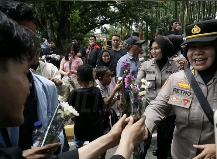Student demonstration in Riau was welcomed by policewomen by distributing flowers